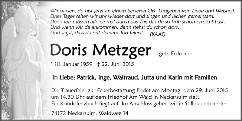 Hier finden Sie alle Traueranzeigen aus der Zeitung, die bisher für Doris Metzger erschienen sind. Weitere Traueranzeigen, die in der Zeitung erscheinen, werden hier ebenfalls aufgelistet