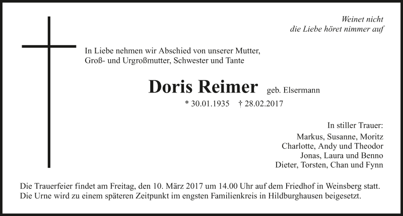 Hier finden Sie alle Traueranzeigen aus der Zeitung, die bisher für Doris Reimer erschienen sind. Weitere Traueranzeigen, die in der Zeitung erscheinen, werden hier ebenfalls aufgelistet