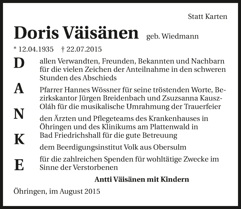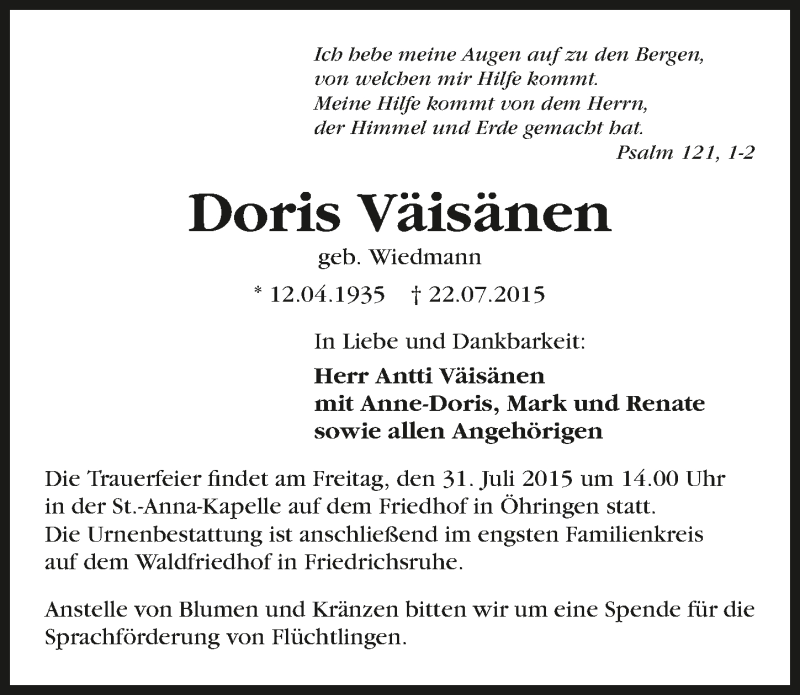 Hier finden Sie alle Traueranzeigen aus der Zeitung, die bisher für Doris Väisänen erschienen sind. Weitere Traueranzeigen, die in der Zeitung erscheinen, werden hier ebenfalls aufgelistet