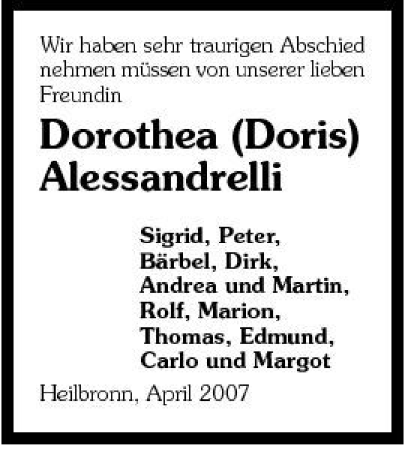 Hier finden Sie alle Traueranzeigen aus der Zeitung, die bisher für Dorothea Alessandrelli erschienen sind. Weitere Traueranzeigen, die in der Zeitung erscheinen, werden hier ebenfalls aufgelistet