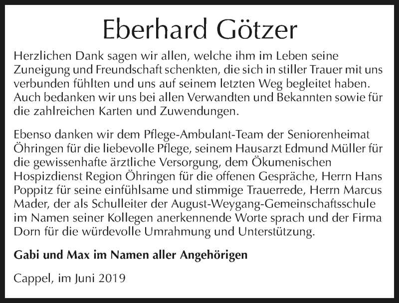 Hier finden Sie alle Traueranzeigen aus der Zeitung, die bisher für Eberhard Götzer erschienen sind. Weitere Traueranzeigen, die in der Zeitung erscheinen, werden hier ebenfalls aufgelistet