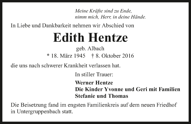 Hier finden Sie alle Traueranzeigen aus der Zeitung, die bisher für Edith Hentze erschienen sind. Weitere Traueranzeigen, die in der Zeitung erscheinen, werden hier ebenfalls aufgelistet