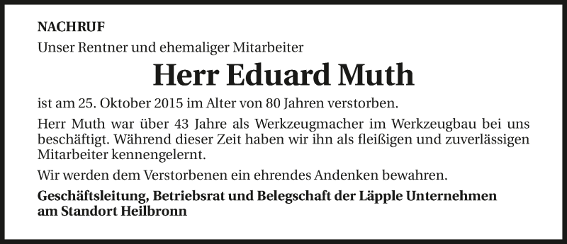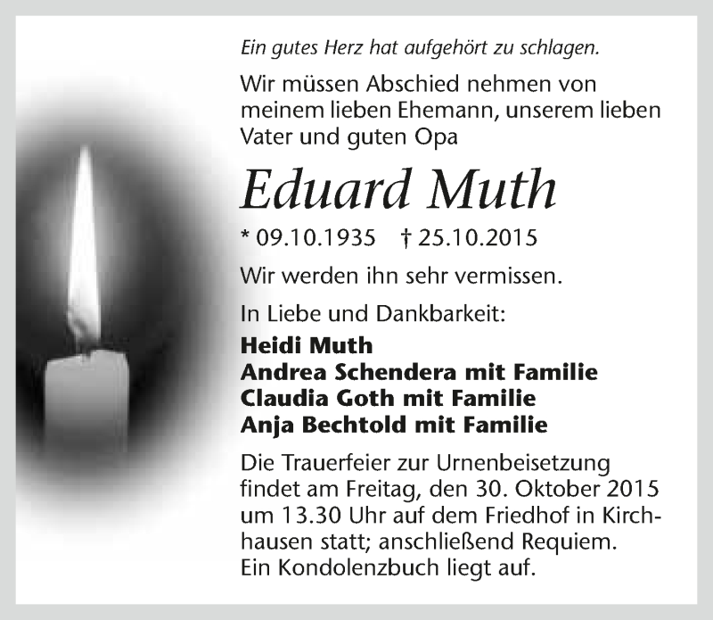 Hier finden Sie alle Traueranzeigen aus der Zeitung, die bisher für Eduard Muth erschienen sind. Weitere Traueranzeigen, die in der Zeitung erscheinen, werden hier ebenfalls aufgelistet