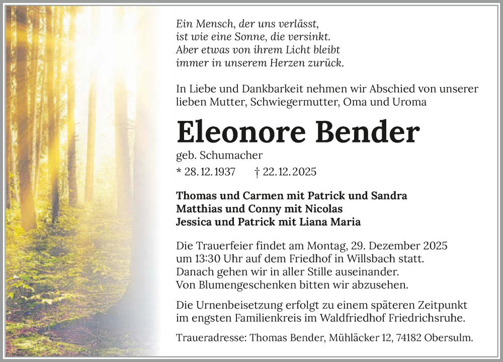 Hier finden Sie alle Traueranzeigen aus der Zeitung, die bisher für Eleonore Bender erschienen sind. Weitere Traueranzeigen, die in der Zeitung erscheinen, werden hier ebenfalls aufgelistet