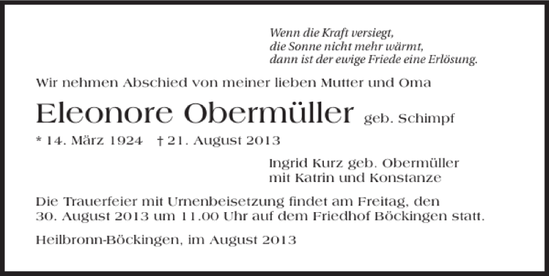 Hier finden Sie alle Traueranzeigen aus der Zeitung, die bisher für Eleonore Obermüller erschienen sind. Weitere Traueranzeigen, die in der Zeitung erscheinen, werden hier ebenfalls aufgelistet