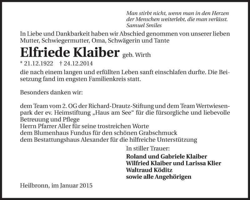 Hier finden Sie alle Traueranzeigen aus der Zeitung, die bisher für Elfriede Klaiber erschienen sind. Weitere Traueranzeigen, die in der Zeitung erscheinen, werden hier ebenfalls aufgelistet