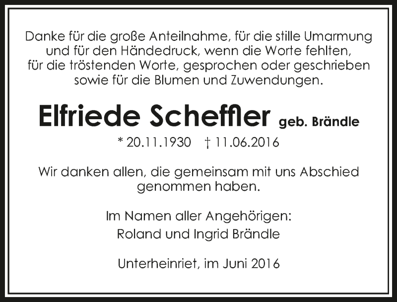 Hier finden Sie alle Traueranzeigen aus der Zeitung, die bisher für Elfriede Scheffler erschienen sind. Weitere Traueranzeigen, die in der Zeitung erscheinen, werden hier ebenfalls aufgelistet