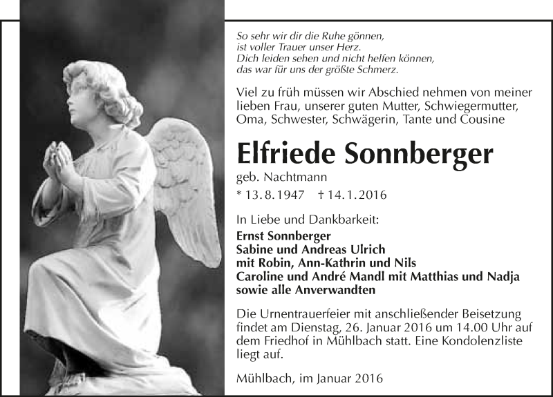 Hier finden Sie alle Traueranzeigen aus der Zeitung, die bisher für Elfriede Sonnberger erschienen sind. Weitere Traueranzeigen, die in der Zeitung erscheinen, werden hier ebenfalls aufgelistet