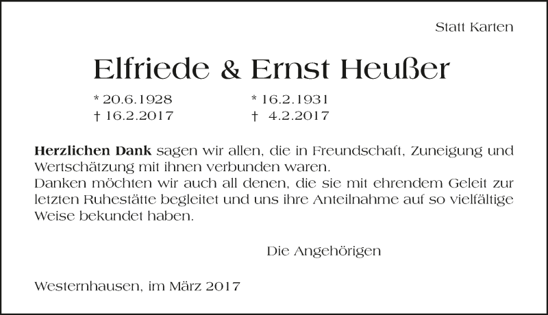 Hier finden Sie alle Traueranzeigen aus der Zeitung, die bisher für Elfriede und Ernst Heußer erschienen sind. Weitere Traueranzeigen, die in der Zeitung erscheinen, werden hier ebenfalls aufgelistet