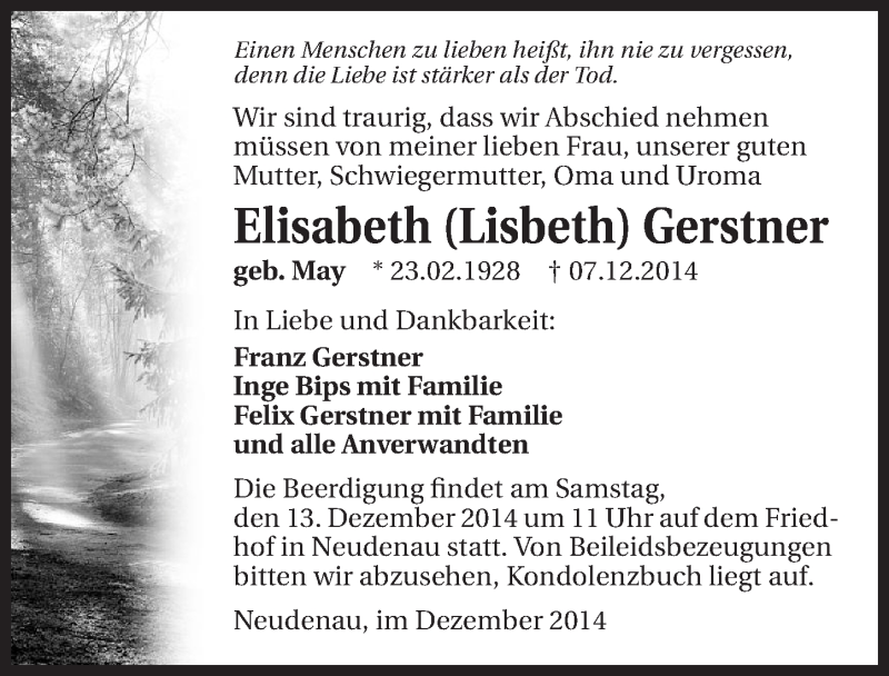 Hier finden Sie alle Traueranzeigen aus der Zeitung, die bisher für Elisabeth Gerstner erschienen sind. Weitere Traueranzeigen, die in der Zeitung erscheinen, werden hier ebenfalls aufgelistet