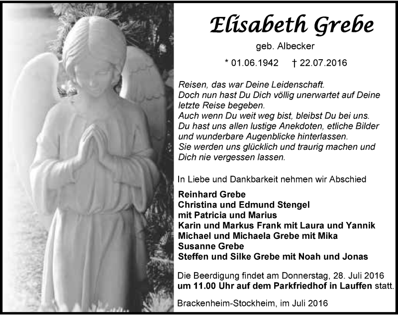 Hier finden Sie alle Traueranzeigen aus der Zeitung, die bisher für Elisabeth Grebe erschienen sind. Weitere Traueranzeigen, die in der Zeitung erscheinen, werden hier ebenfalls aufgelistet