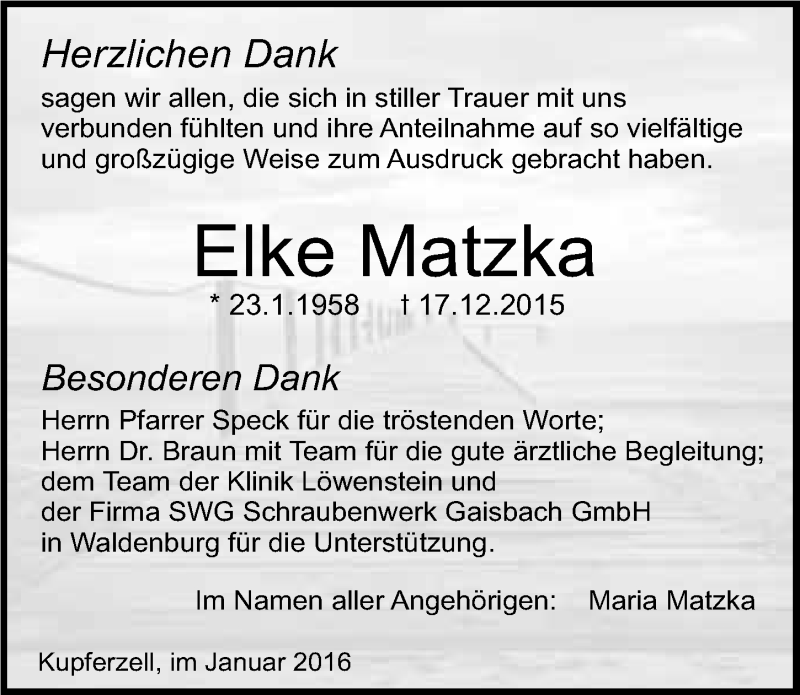 Hier finden Sie alle Traueranzeigen aus der Zeitung, die bisher für Elke Matzka erschienen sind. Weitere Traueranzeigen, die in der Zeitung erscheinen, werden hier ebenfalls aufgelistet