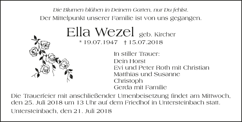 Hier finden Sie alle Traueranzeigen aus der Zeitung, die bisher für Ella Wezel erschienen sind. Weitere Traueranzeigen, die in der Zeitung erscheinen, werden hier ebenfalls aufgelistet