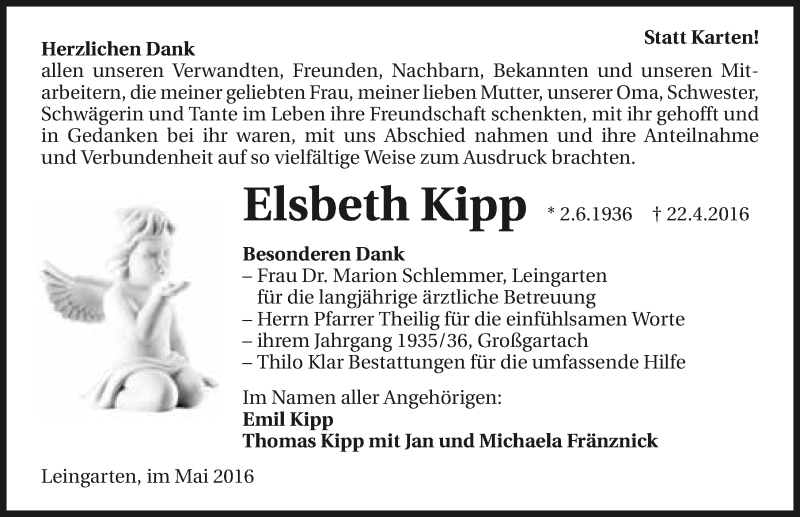 Hier finden Sie alle Traueranzeigen aus der Zeitung, die bisher für Elsbeth Kipp erschienen sind. Weitere Traueranzeigen, die in der Zeitung erscheinen, werden hier ebenfalls aufgelistet