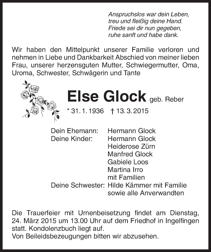 Hier finden Sie alle Traueranzeigen aus der Zeitung, die bisher für Else Glock erschienen sind. Weitere Traueranzeigen, die in der Zeitung erscheinen, werden hier ebenfalls aufgelistet