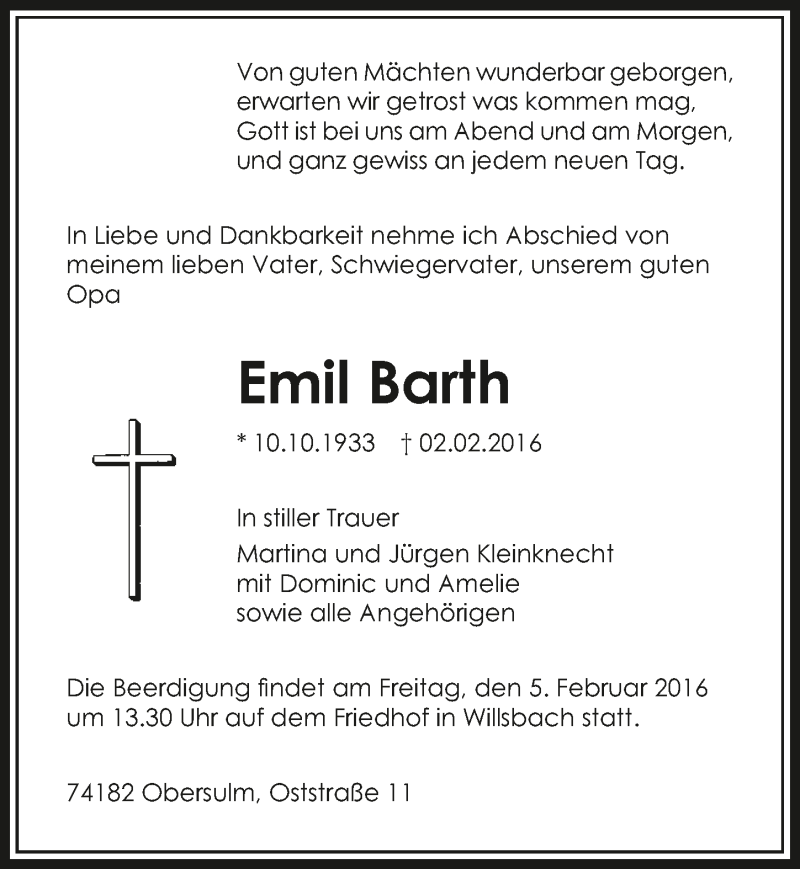 Hier finden Sie alle Traueranzeigen aus der Zeitung, die bisher für Emil Barth erschienen sind. Weitere Traueranzeigen, die in der Zeitung erscheinen, werden hier ebenfalls aufgelistet