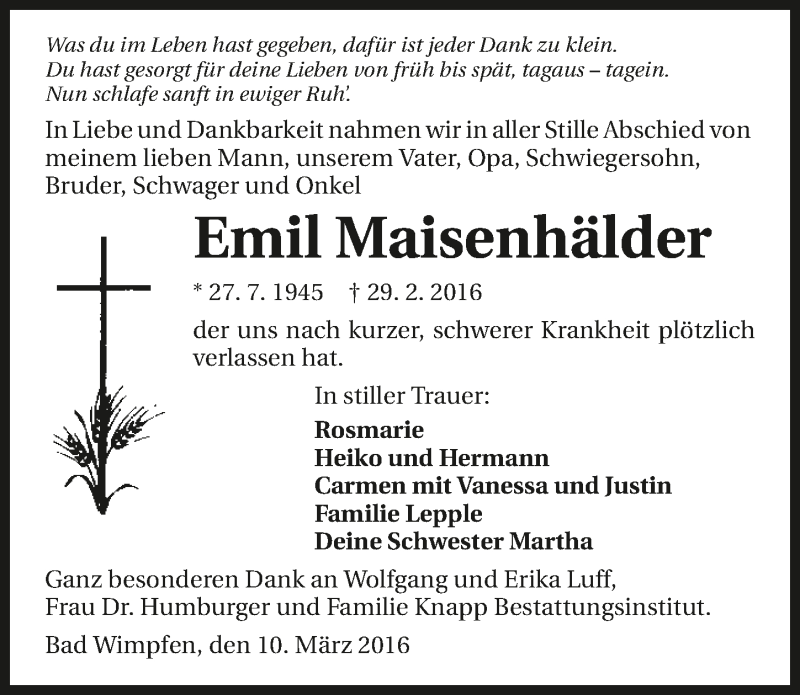 Hier finden Sie alle Traueranzeigen aus der Zeitung, die bisher für Emil Maisenhälder erschienen sind. Weitere Traueranzeigen, die in der Zeitung erscheinen, werden hier ebenfalls aufgelistet