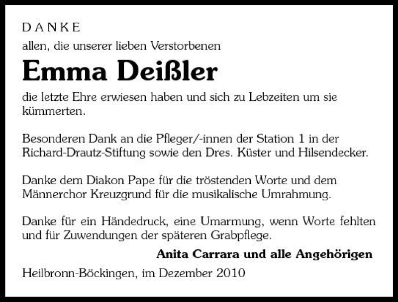 Hier finden Sie alle Traueranzeigen aus der Zeitung, die bisher für Emma Deißler erschienen sind. Weitere Traueranzeigen, die in der Zeitung erscheinen, werden hier ebenfalls aufgelistet