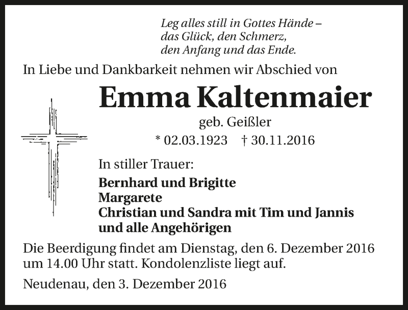 Hier finden Sie alle Traueranzeigen aus der Zeitung, die bisher für Emma Kaltenmaier erschienen sind. Weitere Traueranzeigen, die in der Zeitung erscheinen, werden hier ebenfalls aufgelistet