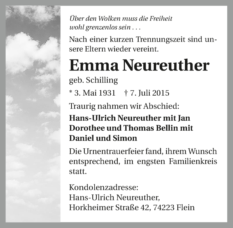 Hier finden Sie alle Traueranzeigen aus der Zeitung, die bisher für Emma Neureuter erschienen sind. Weitere Traueranzeigen, die in der Zeitung erscheinen, werden hier ebenfalls aufgelistet