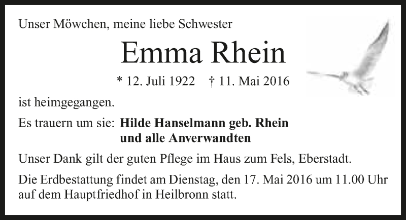 Hier finden Sie alle Traueranzeigen aus der Zeitung, die bisher für Emma Rhein erschienen sind. Weitere Traueranzeigen, die in der Zeitung erscheinen, werden hier ebenfalls aufgelistet