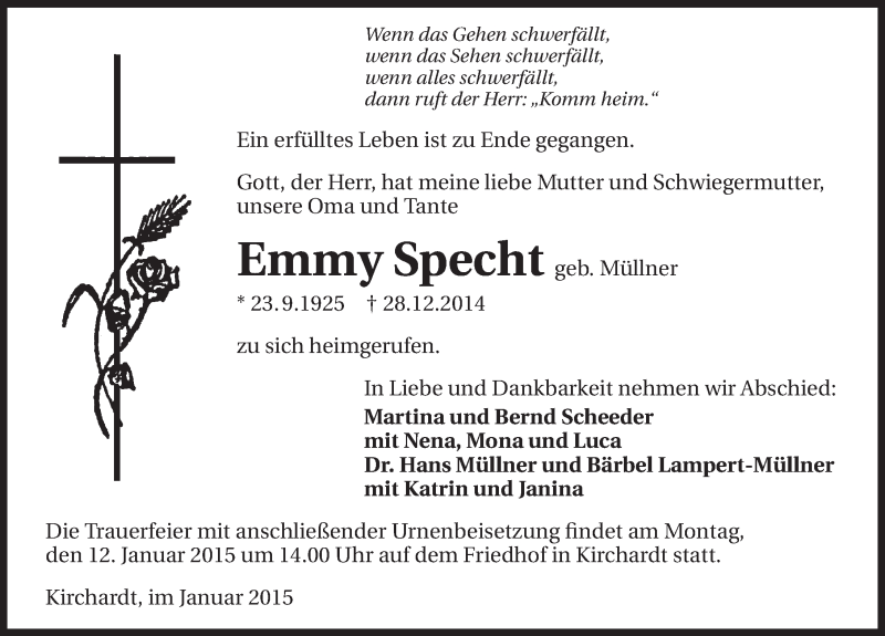 Hier finden Sie alle Traueranzeigen aus der Zeitung, die bisher für Emmy Specht erschienen sind. Weitere Traueranzeigen, die in der Zeitung erscheinen, werden hier ebenfalls aufgelistet