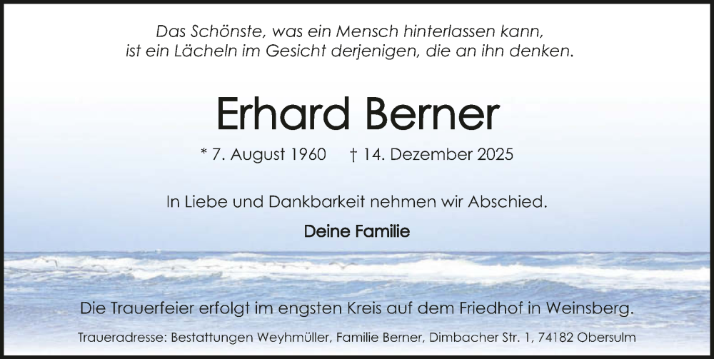 Hier finden Sie alle Traueranzeigen aus der Zeitung, die bisher für Erhard Berner erschienen sind. Weitere Traueranzeigen, die in der Zeitung erscheinen, werden hier ebenfalls aufgelistet
