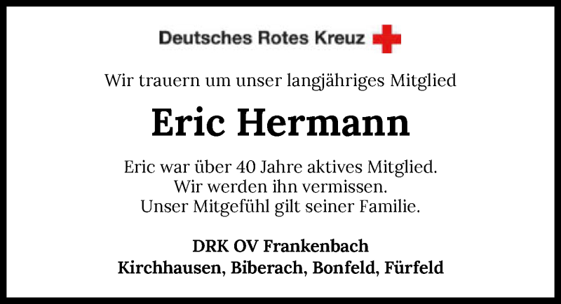 Hier finden Sie alle Traueranzeigen aus der Zeitung, die bisher für Eric Hermann erschienen sind. Weitere Traueranzeigen, die in der Zeitung erscheinen, werden hier ebenfalls aufgelistet