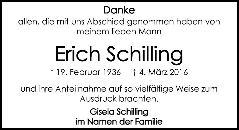 Hier finden Sie alle Traueranzeigen aus der Zeitung, die bisher für Erich Schilling erschienen sind. Weitere Traueranzeigen, die in der Zeitung erscheinen, werden hier ebenfalls aufgelistet