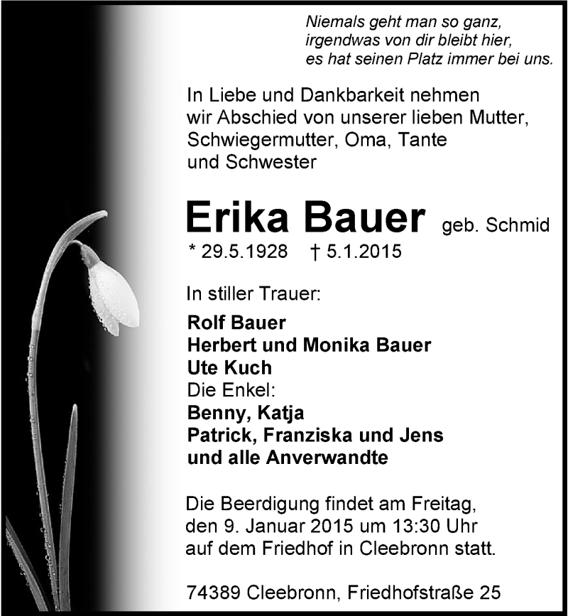 Hier finden Sie alle Traueranzeigen aus der Zeitung, die bisher für Erika Bauer erschienen sind. Weitere Traueranzeigen, die in der Zeitung erscheinen, werden hier ebenfalls aufgelistet