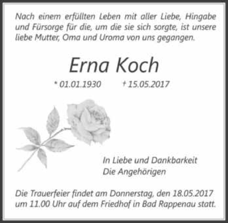 Hier finden Sie alle Traueranzeigen aus der Zeitung, die bisher für Erna Koch erschienen sind. Weitere Traueranzeigen, die in der Zeitung erscheinen, werden hier ebenfalls aufgelistet