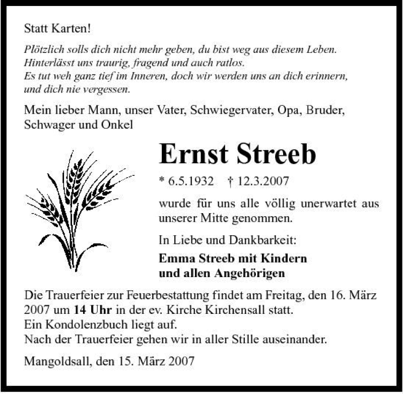 Hier finden Sie alle Traueranzeigen aus der Zeitung, die bisher für Ernst Streeb erschienen sind. Weitere Traueranzeigen, die in der Zeitung erscheinen, werden hier ebenfalls aufgelistet