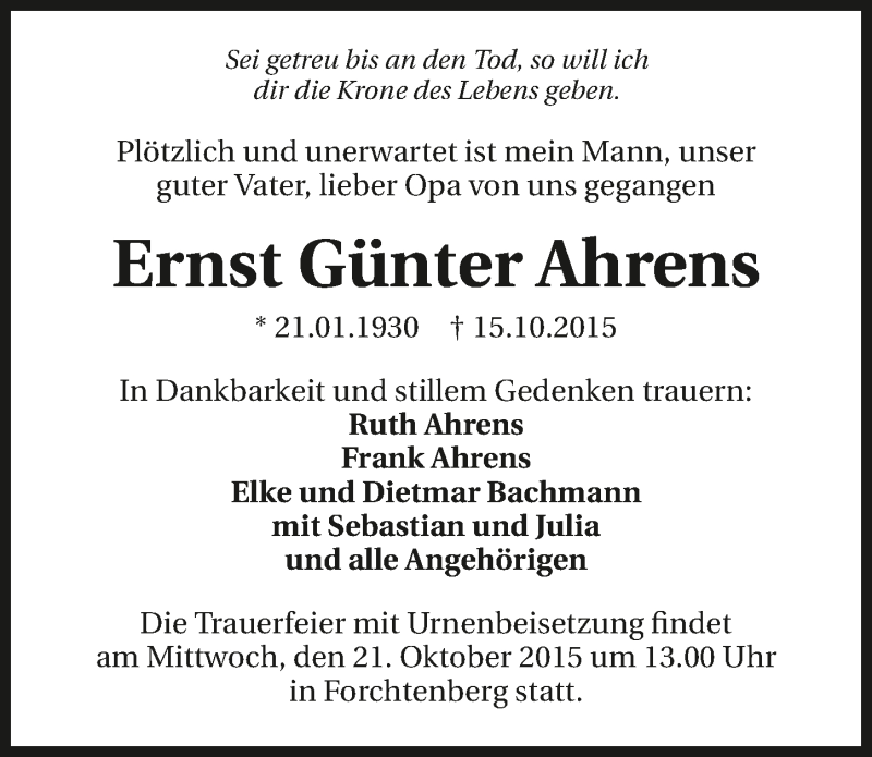 Hier finden Sie alle Traueranzeigen aus der Zeitung, die bisher für Ernst Günter Ahrens erschienen sind. Weitere Traueranzeigen, die in der Zeitung erscheinen, werden hier ebenfalls aufgelistet