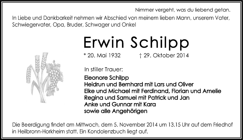 Hier finden Sie alle Traueranzeigen aus der Zeitung, die bisher für Erwin Schilpp erschienen sind. Weitere Traueranzeigen, die in der Zeitung erscheinen, werden hier ebenfalls aufgelistet