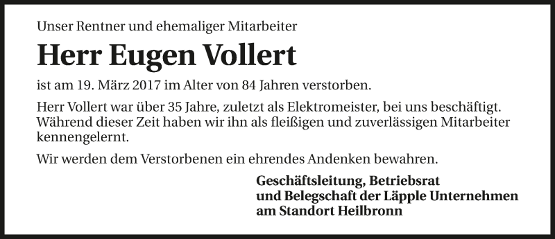 Hier finden Sie alle Traueranzeigen aus der Zeitung, die bisher für Eugen Vollert erschienen sind. Weitere Traueranzeigen, die in der Zeitung erscheinen, werden hier ebenfalls aufgelistet
