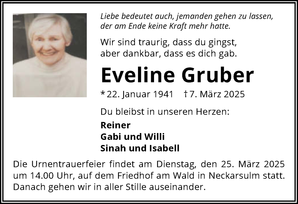 Hier finden Sie alle Traueranzeigen aus der Zeitung, die bisher für Eveline Gruber erschienen sind. Weitere Traueranzeigen, die in der Zeitung erscheinen, werden hier ebenfalls aufgelistet