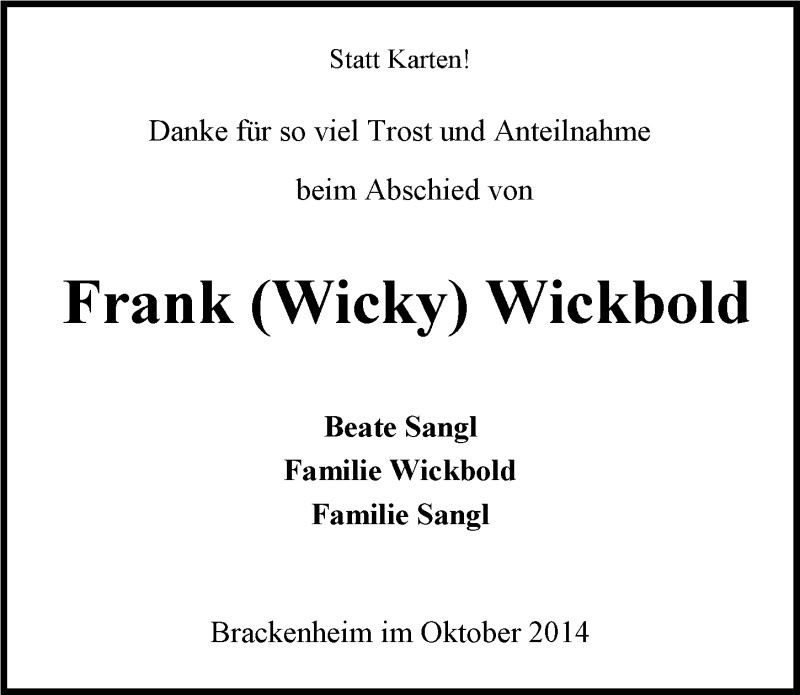 Hier finden Sie alle Traueranzeigen aus der Zeitung, die bisher für Frank Wickbold erschienen sind. Weitere Traueranzeigen, die in der Zeitung erscheinen, werden hier ebenfalls aufgelistet