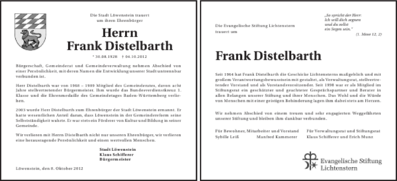 Hier finden Sie alle Traueranzeigen aus der Zeitung, die bisher für Frank Distelbarth Frank Distelbarth erschienen sind. Weitere Traueranzeigen, die in der Zeitung erscheinen, werden hier ebenfalls aufgelistet