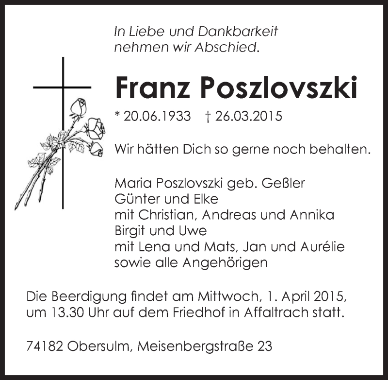 Hier finden Sie alle Traueranzeigen aus der Zeitung, die bisher für Franz Poszlovszki erschienen sind. Weitere Traueranzeigen, die in der Zeitung erscheinen, werden hier ebenfalls aufgelistet
