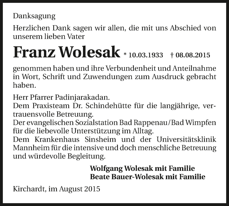 Hier finden Sie alle Traueranzeigen aus der Zeitung, die bisher für Franz Wolesak erschienen sind. Weitere Traueranzeigen, die in der Zeitung erscheinen, werden hier ebenfalls aufgelistet
