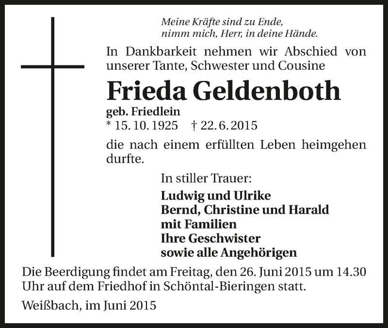 Hier finden Sie alle Traueranzeigen aus der Zeitung, die bisher für Frieda Geldenboth erschienen sind. Weitere Traueranzeigen, die in der Zeitung erscheinen, werden hier ebenfalls aufgelistet