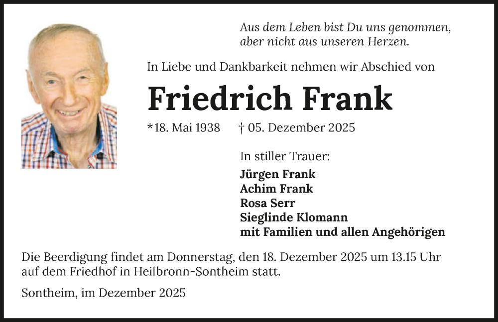 Hier finden Sie alle Traueranzeigen aus der Zeitung, die bisher für Friedrich Frank erschienen sind. Weitere Traueranzeigen, die in der Zeitung erscheinen, werden hier ebenfalls aufgelistet