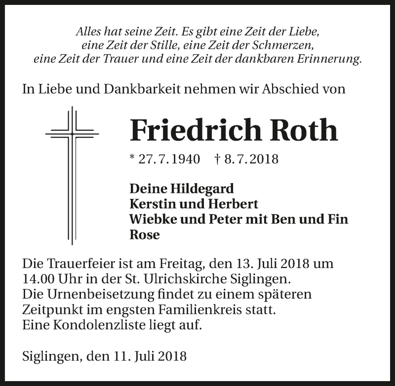 Hier finden Sie alle Traueranzeigen aus der Zeitung, die bisher für Friedrich Roth erschienen sind. Weitere Traueranzeigen, die in der Zeitung erscheinen, werden hier ebenfalls aufgelistet