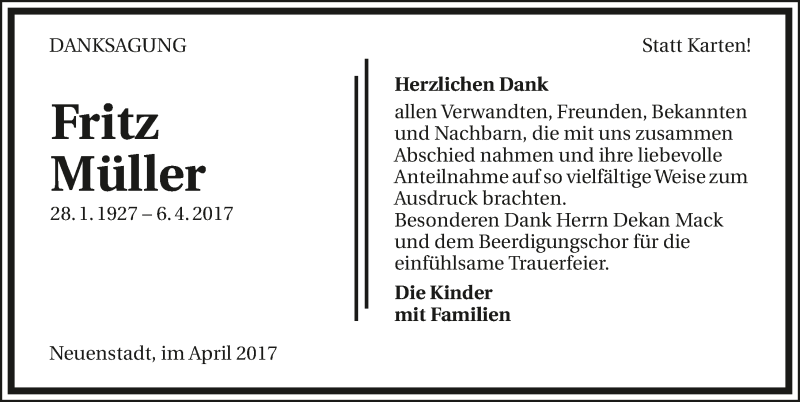Hier finden Sie alle Traueranzeigen aus der Zeitung, die bisher für Fritz Müller erschienen sind. Weitere Traueranzeigen, die in der Zeitung erscheinen, werden hier ebenfalls aufgelistet