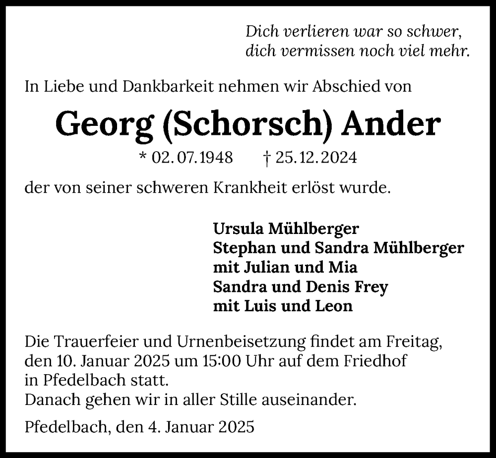 Hier finden Sie alle Traueranzeigen aus der Zeitung, die bisher für Georg Ander erschienen sind. Weitere Traueranzeigen, die in der Zeitung erscheinen, werden hier ebenfalls aufgelistet