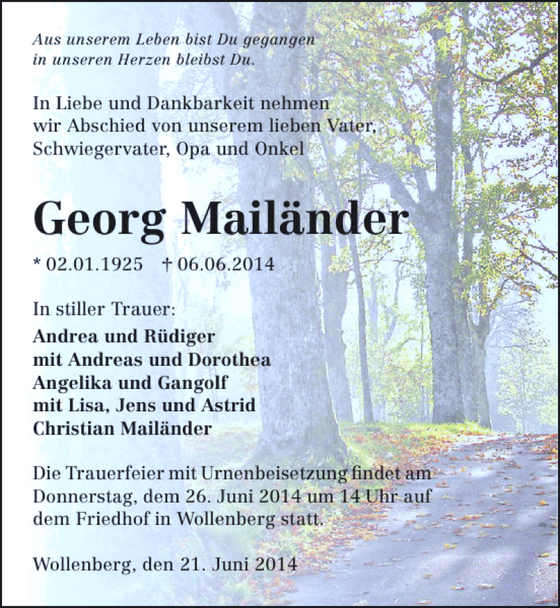 Hier finden Sie alle Traueranzeigen aus der Zeitung, die bisher für Georg Mailänder erschienen sind. Weitere Traueranzeigen, die in der Zeitung erscheinen, werden hier ebenfalls aufgelistet