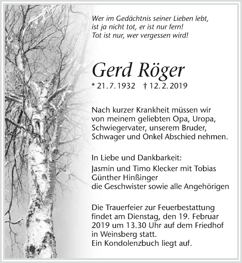 Hier finden Sie alle Traueranzeigen aus der Zeitung, die bisher für Gerd Röger erschienen sind. Weitere Traueranzeigen, die in der Zeitung erscheinen, werden hier ebenfalls aufgelistet