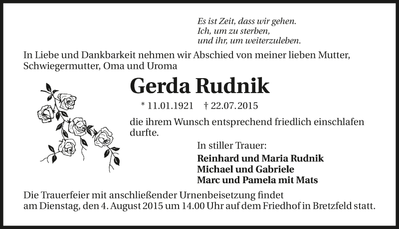Hier finden Sie alle Traueranzeigen aus der Zeitung, die bisher für Gerda Rudnik erschienen sind. Weitere Traueranzeigen, die in der Zeitung erscheinen, werden hier ebenfalls aufgelistet