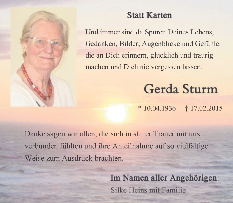Hier finden Sie alle Traueranzeigen aus der Zeitung, die bisher für Gerda Sturm erschienen sind. Weitere Traueranzeigen, die in der Zeitung erscheinen, werden hier ebenfalls aufgelistet