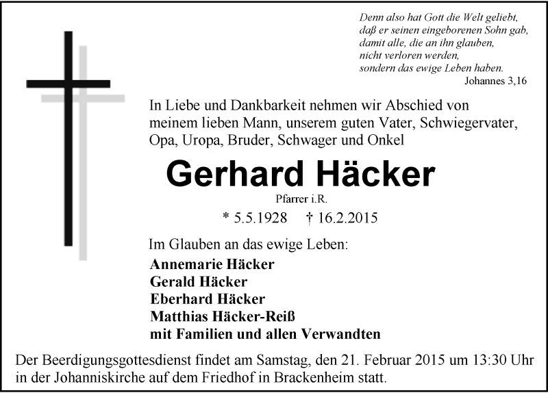 Hier finden Sie alle Traueranzeigen aus der Zeitung, die bisher für Gerhard Häcker erschienen sind. Weitere Traueranzeigen, die in der Zeitung erscheinen, werden hier ebenfalls aufgelistet